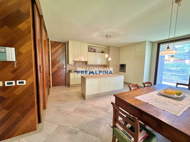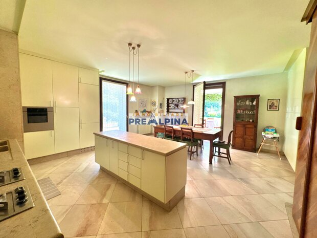 Il piano terra, di oltre 220 mq, accoglie con un’imponente scala in marmo che collega armoniosamente i diversi livelli. L’ampio salone con camino, la sala da pranzo e l’area relax si affacciano direttamente sul giardino, creando un continuo perfetto tra interni ed esterni. La cucina abitabile, dotata di accesso diretto al portico esterno, è ideale per pranzi conviviali e serate eleganti. Completano il piano uno studio riservato, una lavanderia funzionale ed un bagno rifinito nei minimi dettagli.