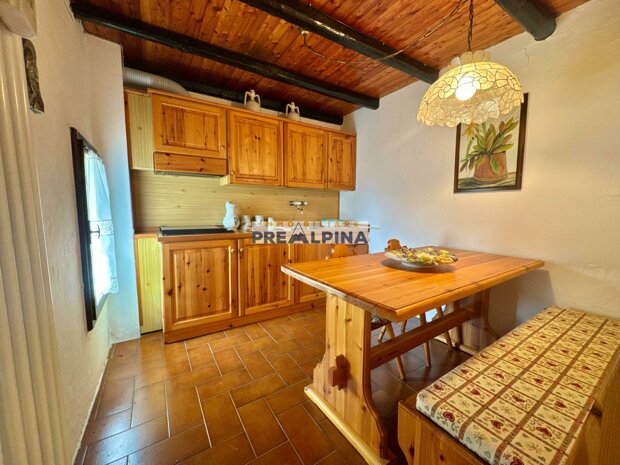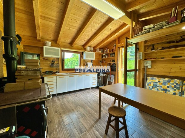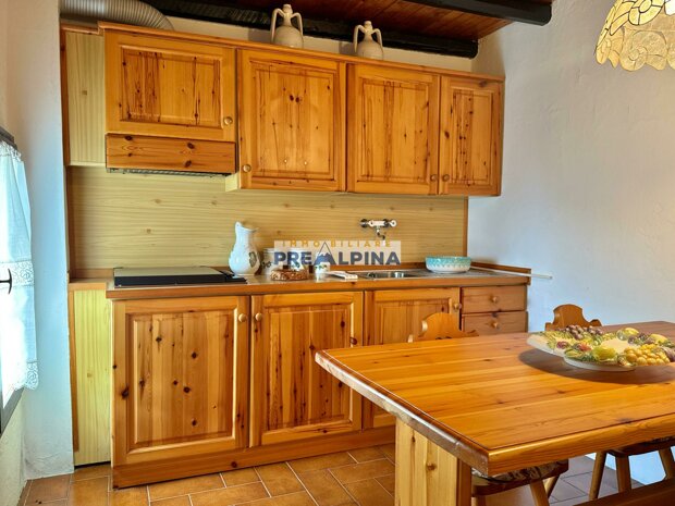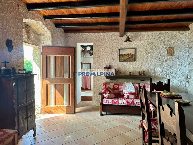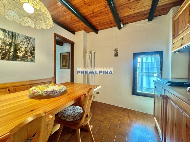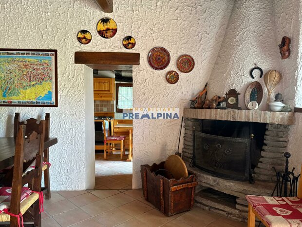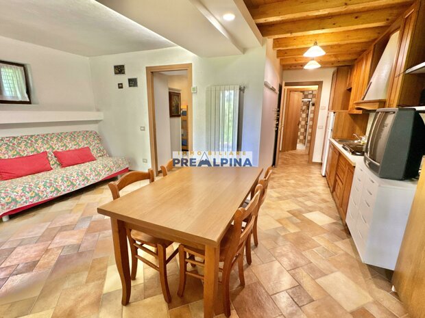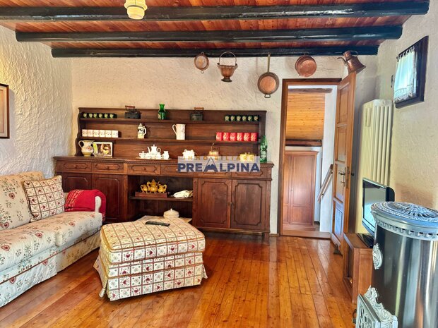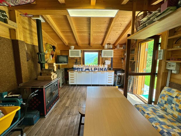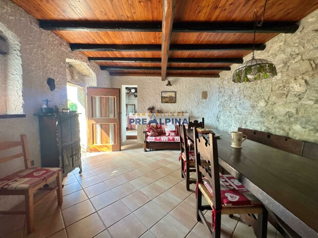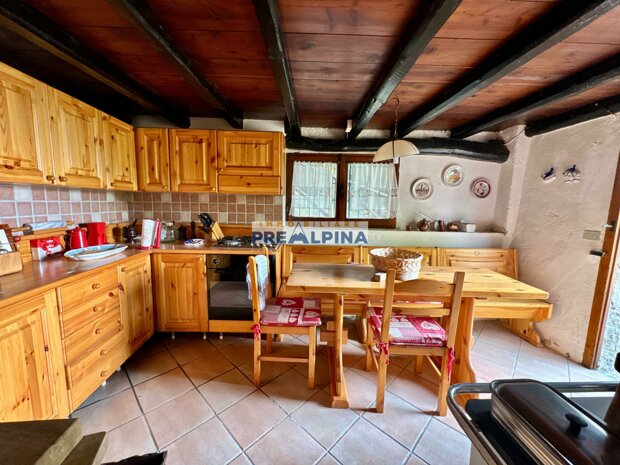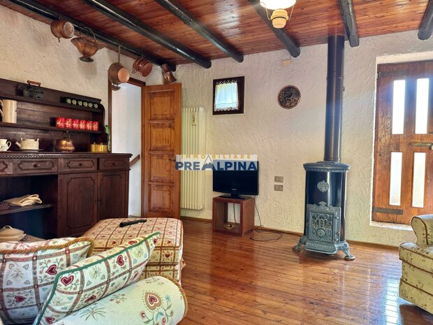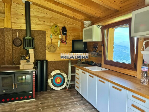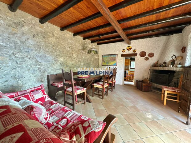 La casa, parzialmente ristrutturata nel 2012, conserva l’anima autentica delle baite di montagna, con travi e solette in legno, pietra e dettagli rustici che trasmettono calore. Lo chalet si sviluppa su tre livelli da circa 50 mq ciascuno. Al piano terra ci accoglie una suggestiva taverna con camino e cucina, ideale per cene in compagnia, oltre a una cantina e un piccolo ripostiglio. Salendo al primo piano, accessibile dall’esterno, si entra nella zona giorno con una sala raccolta, una seconda cucina, una camera matrimoniale e un bagno con doccia. L’attuale disposizione, pensata per separare la parte conviviale da quella privata, può essere facilmente modificata creando un collegamento interno, grazie alla struttura in legno che rende semplici gli interventi. Il secondo piano, ricavato nel sottotetto, ospita due stanze attualmente utilizzate come camere da letto.