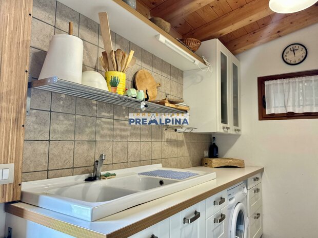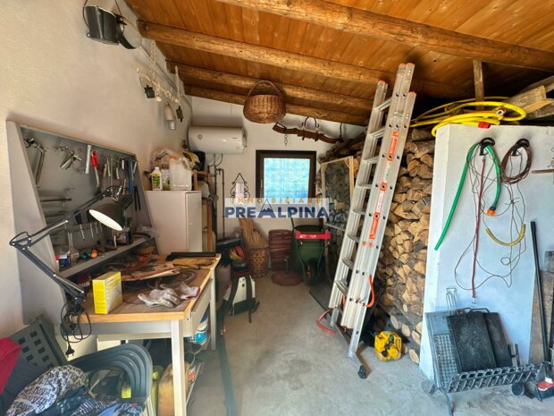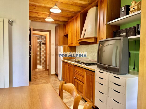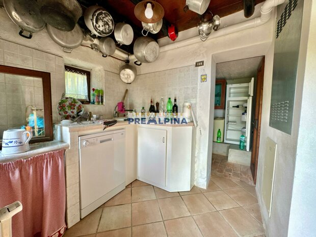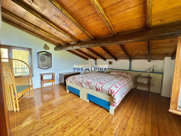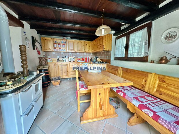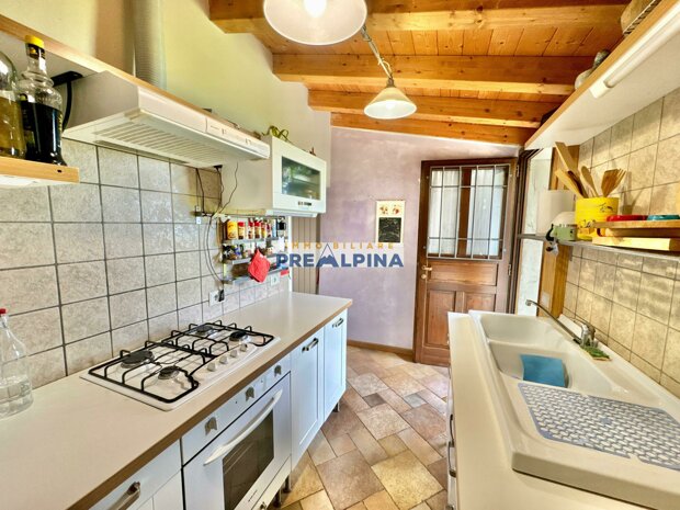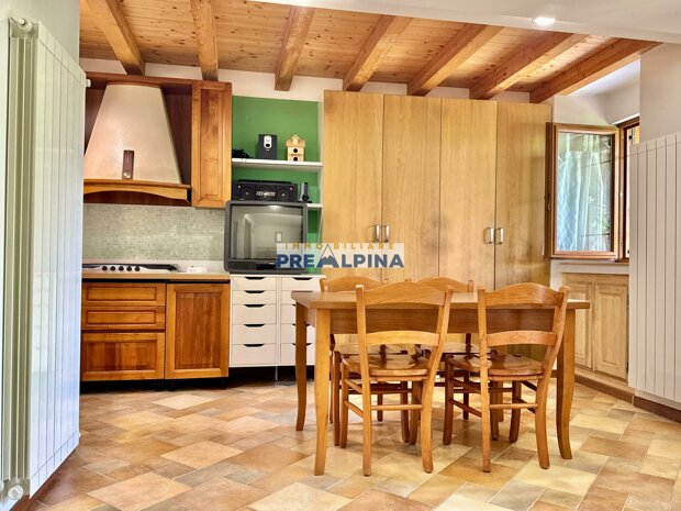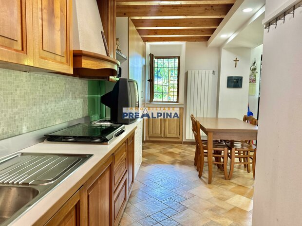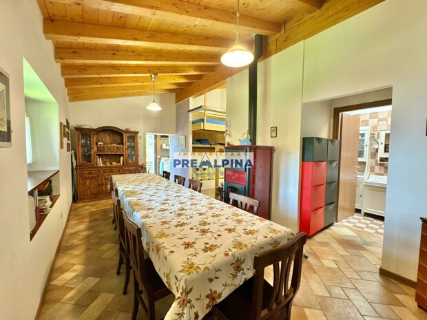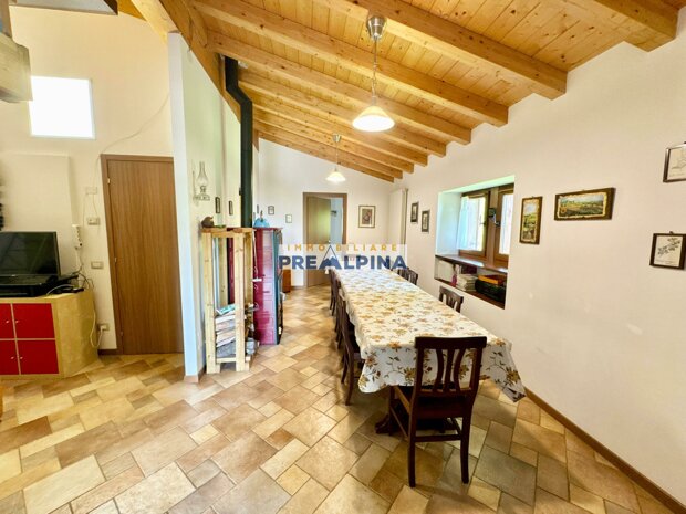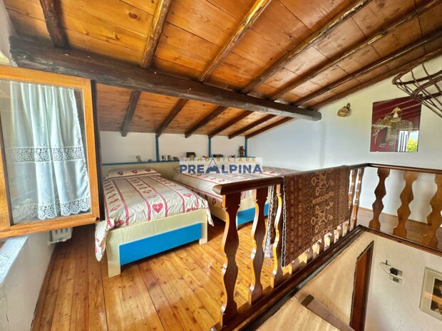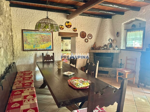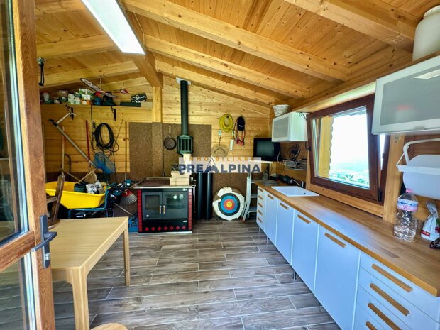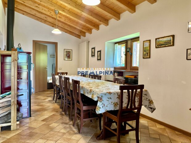 La casa, parzialmente ristrutturata nel 2012, conserva l’anima autentica delle baite di montagna, con travi e solette in legno, pietra e dettagli rustici che trasmettono calore. Lo chalet si sviluppa su tre livelli da circa 50 mq ciascuno. Al piano terra ci accoglie una suggestiva taverna con camino e cucina, ideale per cene in compagnia, oltre a una cantina e un piccolo ripostiglio. Salendo al primo piano, accessibile dall’esterno, si entra nella zona giorno con una sala raccolta, una seconda cucina, una camera matrimoniale e un bagno con doccia. L’attuale disposizione, pensata per separare la parte conviviale da quella privata, può essere facilmente modificata creando un collegamento interno, grazie alla struttura in legno che rende semplici gli interventi. Il secondo piano, ricavato nel sottotetto, ospita due stanze attualmente utilizzate come camere da letto.