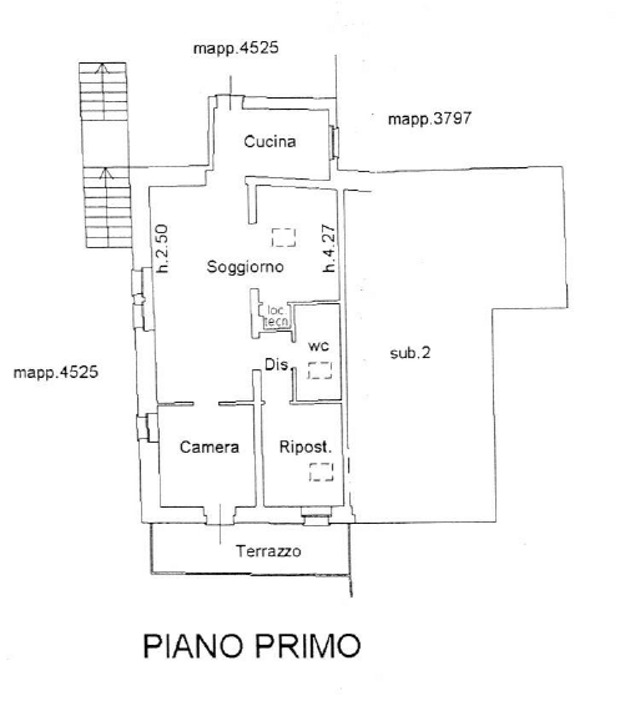 Piano secondo: uguale disposizione del piano primo, con due locali, loggia e balcone.